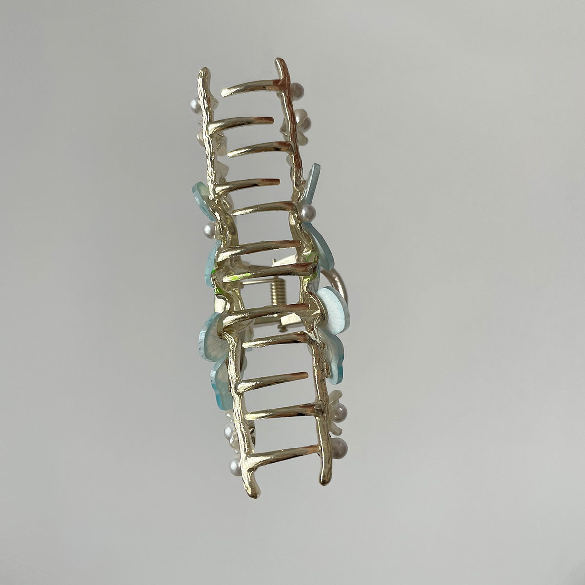 This handmade hair claw features a double butterfly design with pearl and floral accents, adding a touch of romantic elegance. It’s perfect for enhancing a variety of graceful hairstyles with a fresh charm.