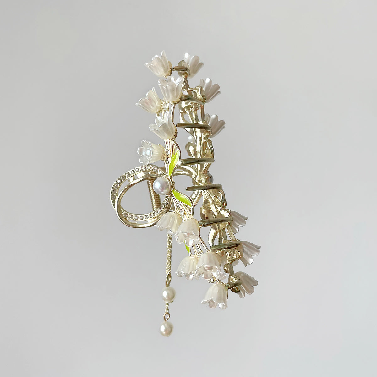 Handcrafted metal hair clip adorned with lily-of-the-valley flowers and a golden bow, complete with delicate tassel chains and a pearl accent. This elegant piece adds a romantic, vintage touch to any hairstyle, perfect for special occasions or everyday wear.